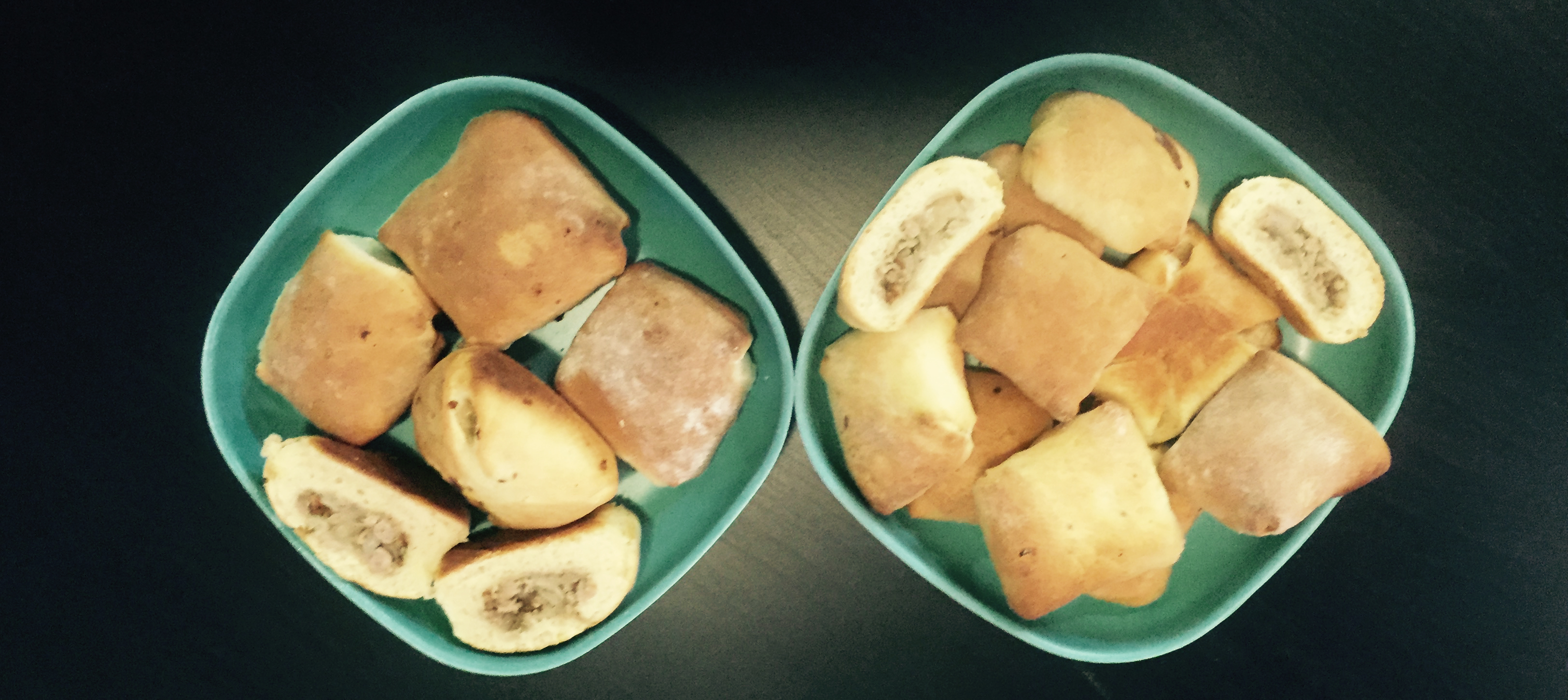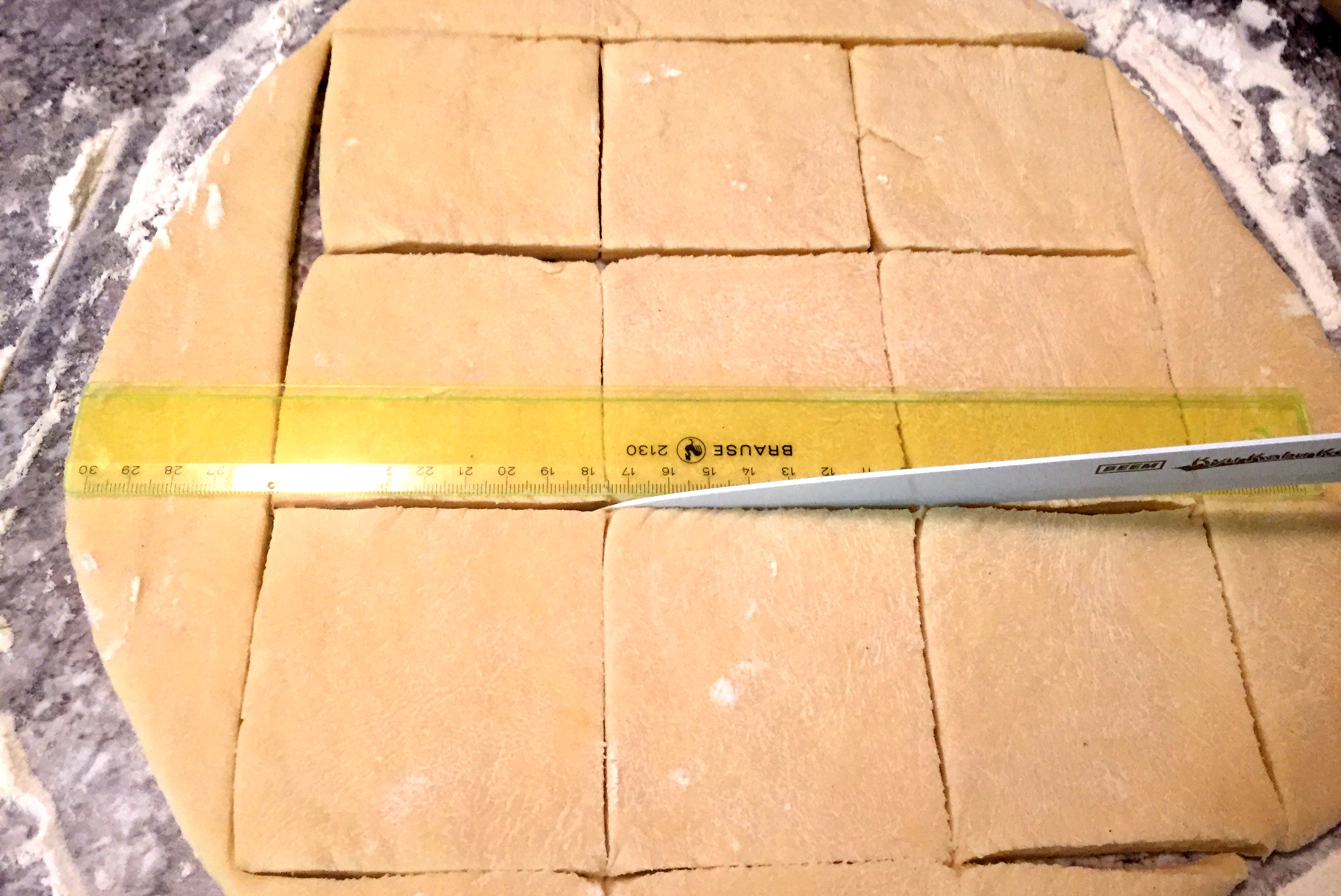 Teig ausrollen bis es eine Dicke von 3mm erreicht ist danach 7,5 x 7,5 cm große Quadrate ausschneiden. Füllen Sie nun die Quadrate mit paar Löffeln des Hackfleisch/Weißkohlmixes. Bringen Sie nun die Ecken jeder Seite zusammen und versichern Sie sich, dass die Seiten verschlossen sind.