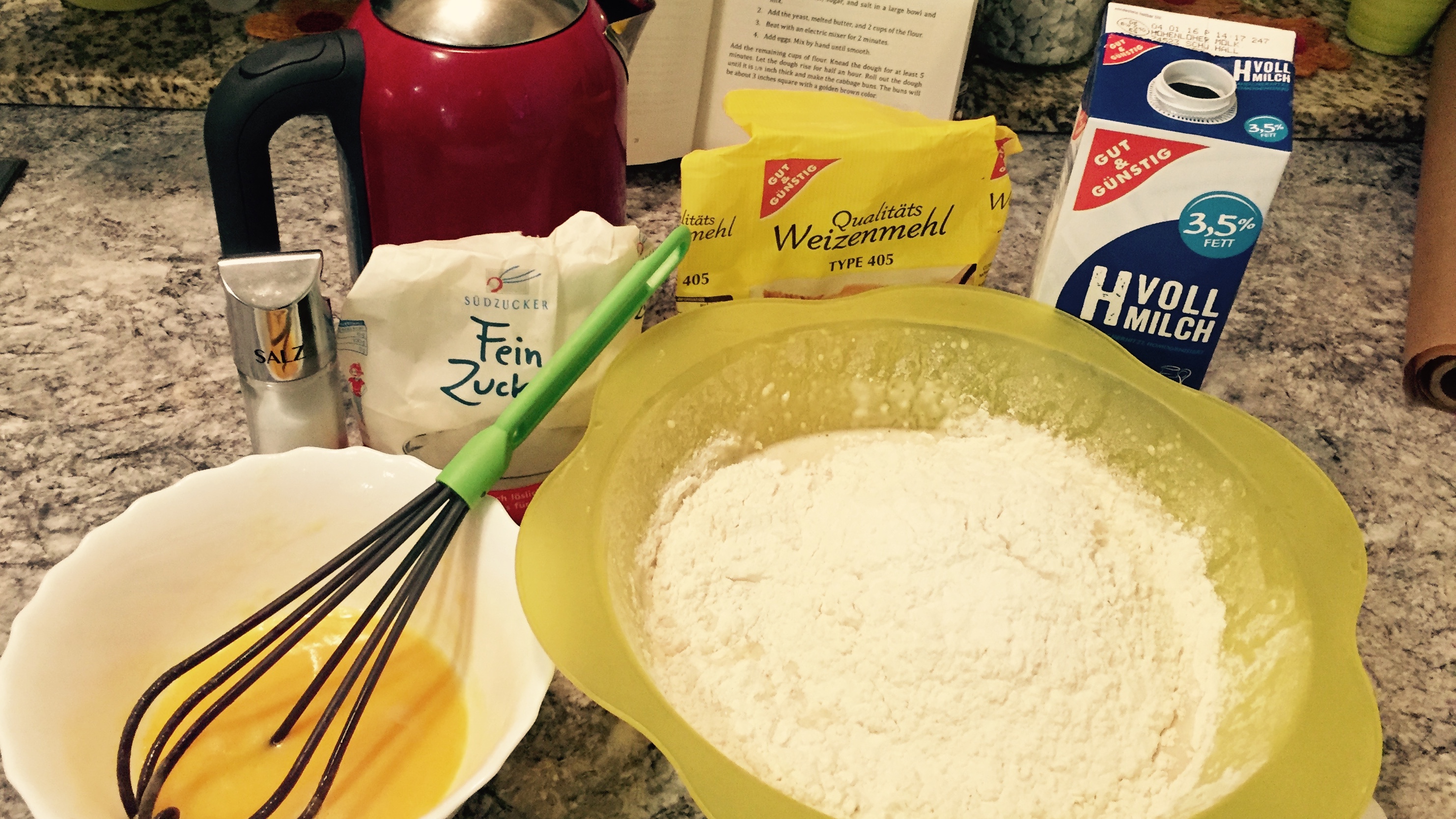 2 Esslöffel Hefe 1 Prise Salz1 EiMilch