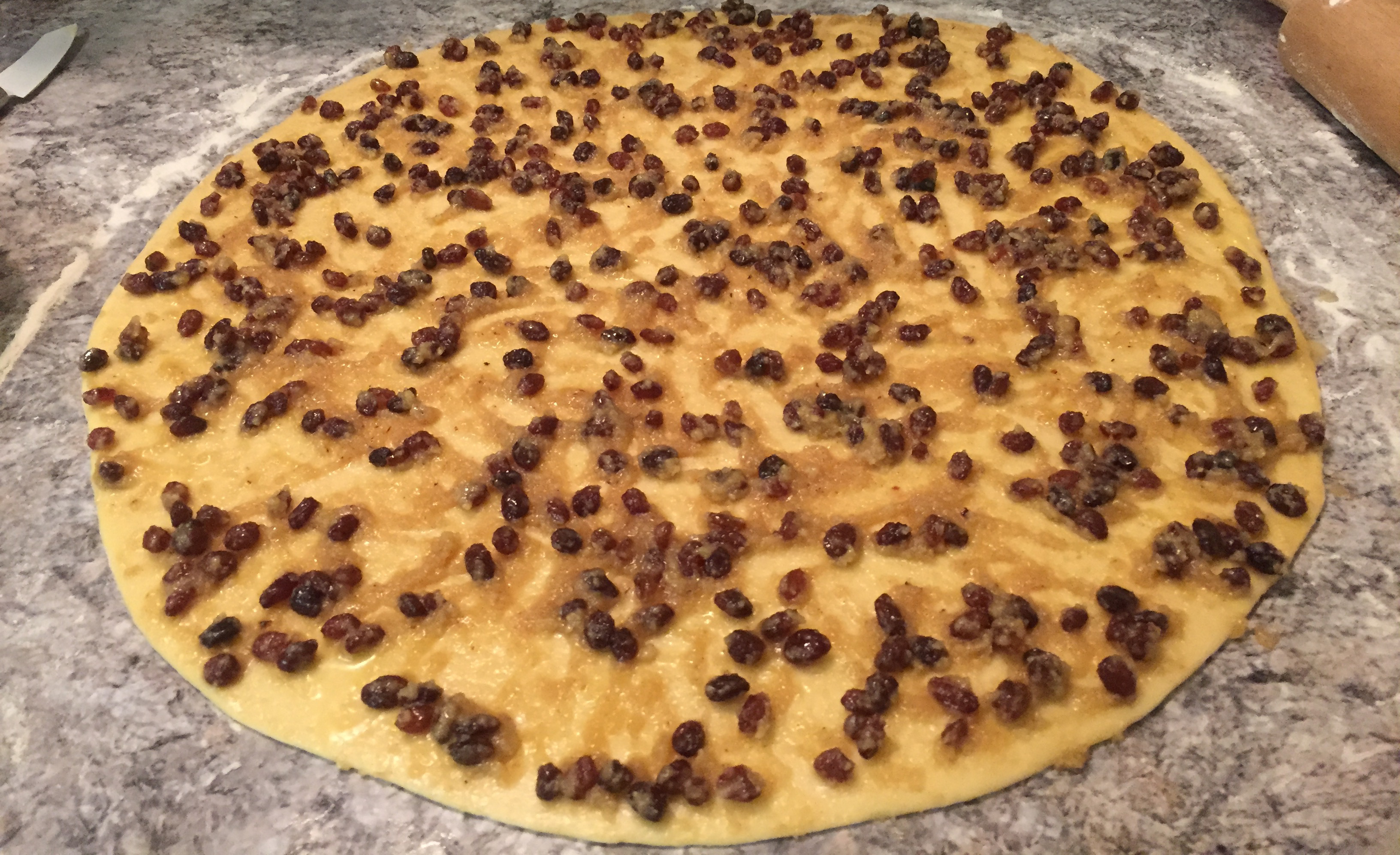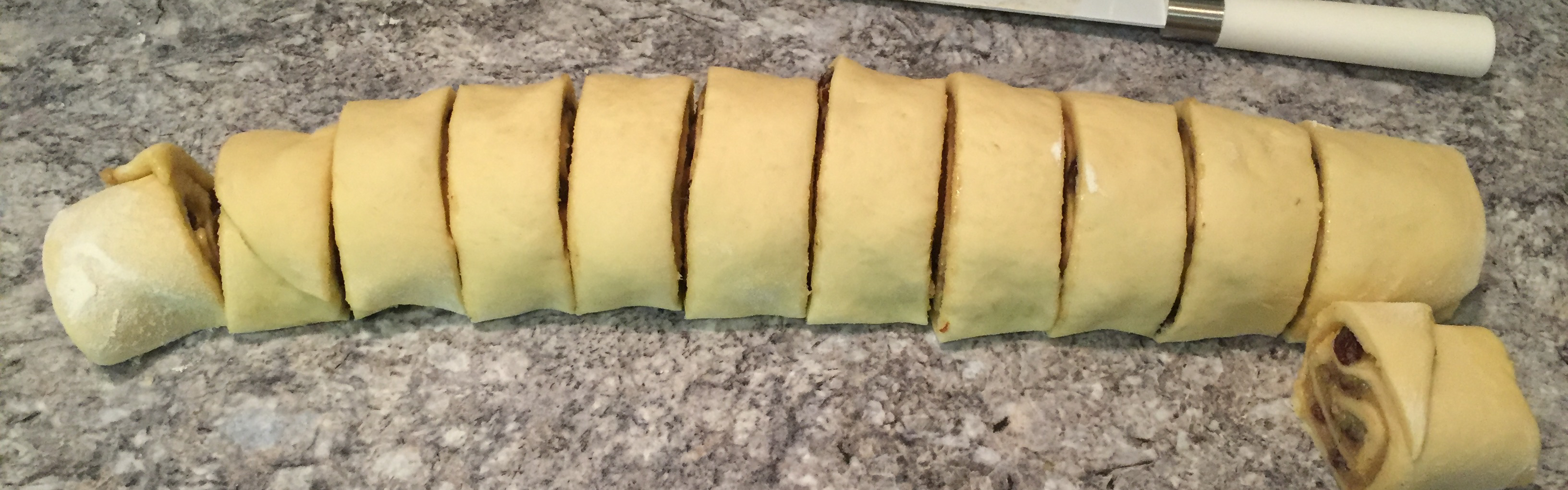 Die resultierende Teigrosinenwurst nun in 2 cm dicke Stücke schneiden. Das reicht für etwa 1 1/2 bis 2 runde Backformen.